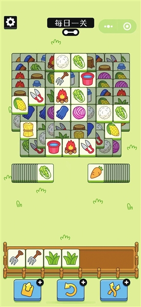 记者打开微信小程序,体验了该游戏。简单来说,《羊了个羊》是将一堆带有不同图案的方形卡片放入下方的7个格的卡槽,三张相同的卡片可以消除。当卡槽里的卡片满了,游戏失败。全部卡片消除完毕,游戏通关。