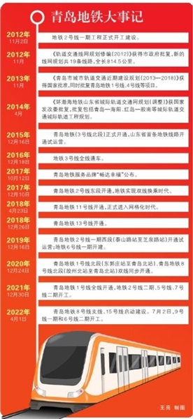 2015年12月16日,青岛地铁(3号线北段)正式开通;2016年12月18日,地铁3号线全线通车;2017年12月10日,青岛地铁2号线东段开通;2018年4月23日,青岛地铁11号线开通;2018年12月26日,青岛地铁13号线开通;2020年12月24日,青岛地铁1号线北段(东郭庄站至青岛北站)、青岛地铁8号线北段(胶州北站至青岛北站)双线同步开通;2021年12月30日,青岛地铁1号线全线开通。