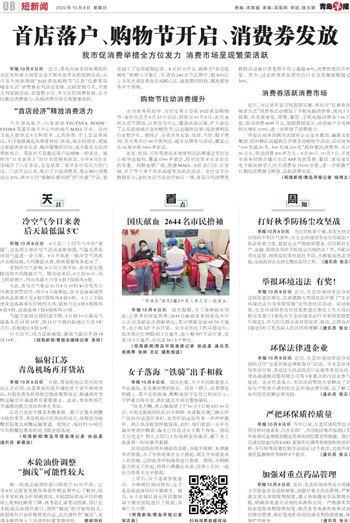 早报10月8日讯 近日,青岛市商务局统筹组织各区市和重点商贸企业开展丰富多彩的促销活动,全市各大商家围绕“2022青岛购物节”以及“亿惠青岛 嗨享生活”消费券系列活动安排,创新营销方式,开展系列促销活动,营造数字化、多元化的消费氛围,全方位激发消费潜力,岛城消费市场呈现繁荣活跃。