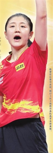 陈梦在比赛中庆祝,她以3比0战胜日本队选手木原美悠。