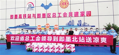 8月17日,即墨区总工会主席衣服坡、党组书记刘玉峰陪同省总工会领导到即墨北站“送清凉”。