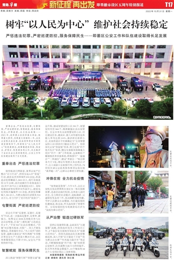 重拳出击,严惩违法犯罪,屯警街面,严密巡逻防控,智慧赋能,服务保障民生,冲锋在前,全力抗击疫情……2021年,是即墨公安经历重大考验、取得重大胜利、实现重大突破的一年,全区公安机关在区委、区政府和青岛市局党委坚强领导下,牢固树立“以人民为中心”的发展理念,统筹推进防风险、保安全、护稳定、促发展各项工作,有力维护了全区社会大局持续稳定,公安工作和队伍建设取得了长足发展。