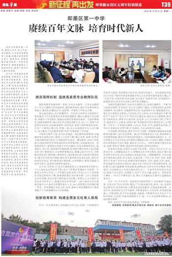 作为一所有着深厚人文底蕴的百年名校,即墨一中的教育任务始终与国家、党的教育目标合拍,培育时代新人。学校根据国务院办公厅《关于新时代推进普通高中育人方式改革的指导意见》,确立了“五育并举,全面发展,特长发展,全员成才”的教育宗旨,在传递知识、技能的同时,培养学生的核心素养和关键能力。