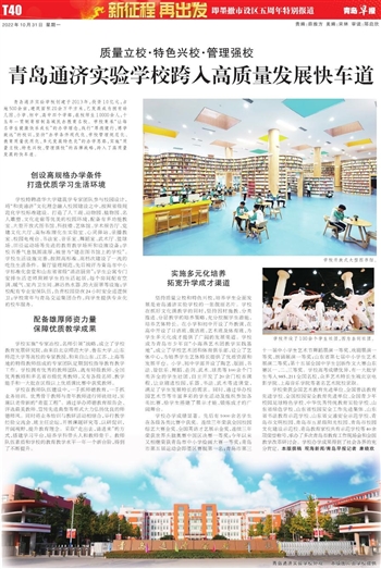 坚持质量立校和特色兴校,培养学生全面发展是青岛通济实验学校的一张靓丽名片。学校在抓好文化课教学的同时,坚持因材施教、分类推进、分层教学的培养策略,充分挖掘学生潜能,培养艺体特长。在小学和初中开设了外教课,在高中开设了日语班、俄语班、艺术班及体育班,为学生多元化成才提供了广阔的发展渠道。学校成为青岛市少年宫“小海燕艺术团教学实践基地”,成立了学校艺术团和体育俱乐部,设立了艺体中心,为培养学生艺体特长提供了优质资源和发展平台。小学、初中学部开设了陶艺、版画、书法、管弦乐、舞蹈、击剑、武术、球类等100余个门类齐全的学生社团,自主开发了20余门校本课程,让京剧进校园,乐器、书法、武术等进课堂,满足了学生发展特长的需求。同时,通过举办校园艺术节等丰富多彩的学生活动及组织参加各类比赛,给学生搭建了展示才能、锻炼成才的广阔舞台。