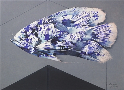 “青花鱼”系列作品是邵昱皓最具代表性的作品之一,作品获得第十届全国水彩粉画作品展最高奖,并被中国美术馆收藏。在2013—2014深圳国际水彩双年展中,中国水彩首次与国际水彩同台参展,《青花鱼》荣获最高奖。谈及创作灵感,邵昱皓坦言,来自于青岛、武汉这两座不同城市的文化碰撞是主因:一个是舶来文化影响的时尚城市,一个是具有浓厚传统的荆楚大地,而两座城市都与水有关,都与鱼的符号有关。同时,鱼在中国传统文化里有美好的意义,邵昱皓认为“鱼”会是自己水彩创作的有效选择。他结合了山东水彩的磅礴、南方水彩的水润,打散重构了景德镇的青花结构,嫁接入水彩创作,终于完成了带有中国元素、极具个性的作品。