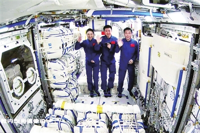 神舟十四号航天员陈冬(中)、刘洋(左)、蔡旭哲进入梦天实验舱。