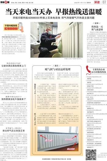 昨日下午,家住市南区徐州路的陆先生也打来电话,反映家里暖气不热的情况。他告诉记者:“我们都不知道已经供暖了,今天跟家里的亲戚聊天才知道开始正式供热了,而且岛城已经低温供热一周了,别人家的暖气早就温乎了。”记者将情况反馈给相关供热公司,该公司供热管家第一时间上门解决。