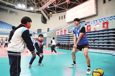 中国石油大学(华东)男排与港头小学排球队互动训练。西海岸新区教体局供图