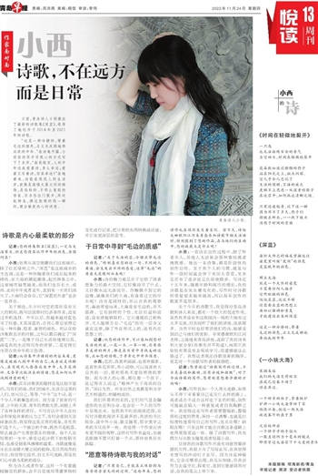 小西:写作犹如一个人埋头走路,如果从不停下来看看自己走在什么样的路上,或者适合不适合这样走下去的时候,创作可能就会陷入一种重复或者自我陶醉之中。我觉得这是写作者需要警惕的,警惕那些过度的赞美,保持一点清醒,也就是比较理性地看待自己的写作,优点在哪?缺陷在哪?只有这样才能在诗歌这条道路上走得更稳更远一些。除了诗歌写作,我也偶尔写点散文随笔或者短篇小说。