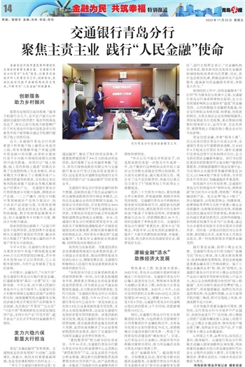 金融是经济高质量发展和增进民生福祉的重要支撑力量。交通银行青岛分行坚守“为民”底色,以服务实体经济和人民需求为己任,创新驱动,坚决扛起时代赋予金融机构的历史使命,不断书写“人民金融”的新篇章。