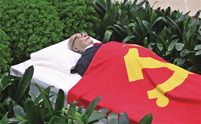12月5日,江泽民同志的遗体安卧在鲜花翠柏丛中,身上覆盖着鲜红的中国共产党党旗。新华社发