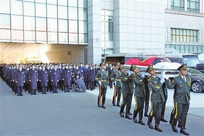 10时20分,8名礼兵荷灵,伴着哀乐缓缓走出告别室。习近平等护送江泽民同志的遗体上灵车。