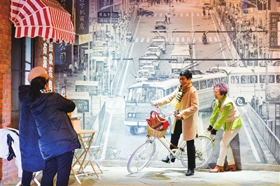 2月6日 几名游客在新落成的“广德里1898街巷”拍照留念。置身其中,仿佛穿越在老青岛的繁华市井当中,能感受到满满的复古感、年代感。