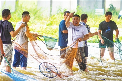 6月28日 接连的几场暴雨造成白沙河水位上涨,大量鱼儿顺流而下,不少市民在漫水坝上拉网捕鱼,收获颇丰。