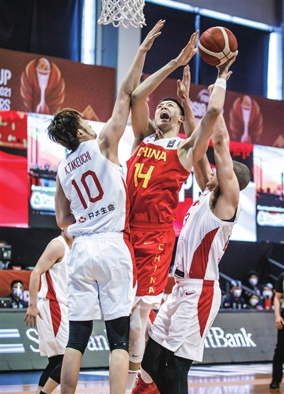 ▼中国男篮球员(中)在比赛中上篮。 新华社发
