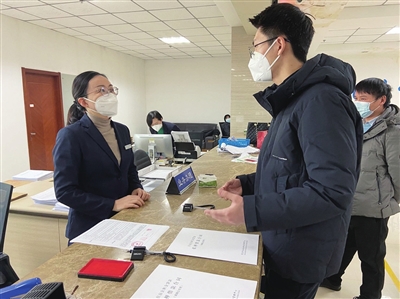 公积金管理中心即墨管理处贷款科长徐笑笙(左)给市民刘先生办理“商转公”业务。