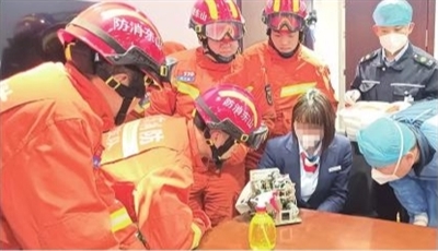 1月14日13时49分,胶州市消防救援大队指挥中心接到报警称,位于胶州市三里河街道一银行内,一名员工手掌被捆钞机卡住无法取出。消防救援人员立即赶赴现场。