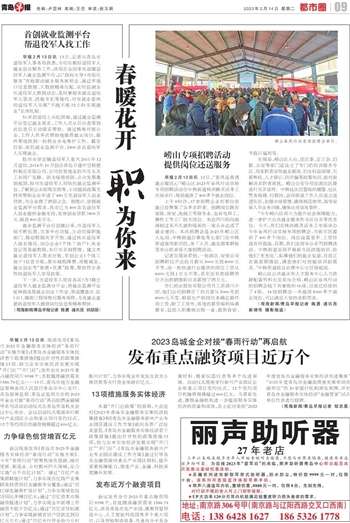 早报2月13日讯 13日,“春风送真情 就业暖民心”崂山区2023年春风行动首场专项招聘活动在中韩街道株洲路灵活务工市场举行,现场提供了400多个就业岗位。