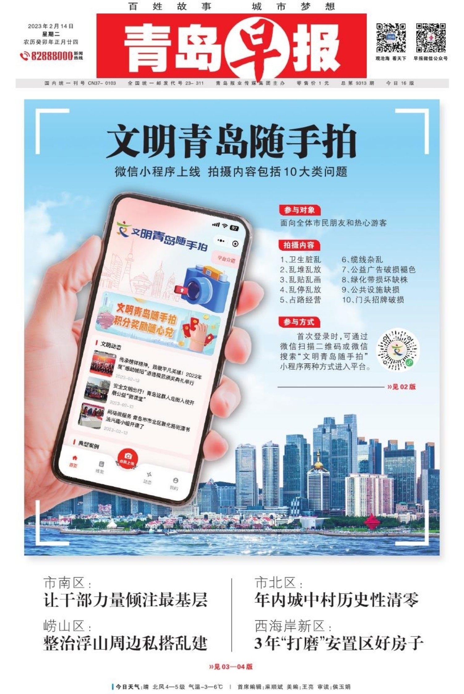 A01 头版 A02 创建全国文明典范城市 A03 城市更新建设,让生活更美好 A04 城市更新建设,让生活更美好 A05 今日看点 A06 青岛面孔 A07 深读 A08 身边事 A09 都市圈 A10 文娱 A11 体育 A12 健康周刊 A13 医声 A14 常青树周刊 A15 才艺 A16 天下