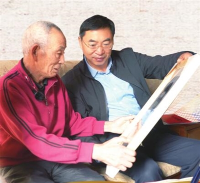 青岛市退役军人事务局副局级领导干部王明生(右),上门为于洪海老人送来画像。