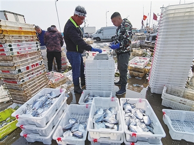 2月24日中午,两条大型渔船陆续在青岛沙子口国家中心渔港靠岸,前来接货的不少渔商开着全冷链海鲜货车,早早就在码头等候。渔船一靠岸,十多名渔民就忙碌着从船舱中卸货。记者注意到,随着一筐筐鲳鱼上岸,码头上的气氛立刻“鲜味”十足。几百筐的鲳鱼摆满了岸边,看上去十分壮观,令人眼馋。