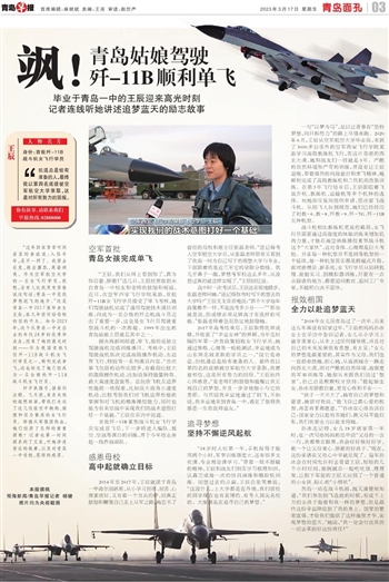 “王辰,我们从网上看到你了,真为你自豪、骄傲!”这几日,王辰经常收到来自青岛一中校友和老师的鼓励和祝福。近日,在空军西安飞行学院某旅,首批歼-11B女飞行学员接受了单飞考核,她们驾驶战机完成了通用驾驶技术课目训练,向成为一名合格的歼击机战斗员迈出了重要一步,这也是女飞行员驾驶重型战斗机的一次跨越。1999年出生的青岛姑娘王辰就是其中之一。