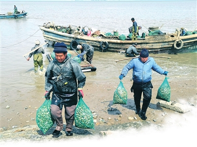 渔民张明山一边忙活一边说,捕捞蛤蜊的时间要根据潮流而定,这几天中午涨潮,就需要提前6到7个小时出海,赶在涨潮前上岸。据介绍,渔船每次大约要在海滩上捕捞7个小时,差不多一条船能收获5000多斤蛤蜊。一袋蛤蜊有上百斤重,在泥滩里挖10多分钟,就能收获满满一袋子。