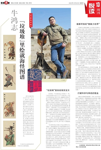 对于牛鸿志的创作,青岛作家、同为海洋文化研究者的盛文强给予盛赞,并欣然为其题写了序言《在神话与科学之间赶海》:“牛鸿志先生绘制的海怪已有二百余种,传统笔墨与现代博物的奇异共振,结成一集颇为可观。国画的材料和技术充当载体,主角却是海怪,还有海怪背后相对应的海洋生物。神话与现实的杂陈并置,同时兼顾了个体经验与民俗传统,乍见之下错愕难当,久而愈觉丘壑超拔,跌宕自喜。画家的勤勉、博物学者的严谨、考据家的宏富、民族志工作者的身体力行,当多种身份并行不悖,集聚在同一人的身上,学科的壁垒轰然倒塌。”
