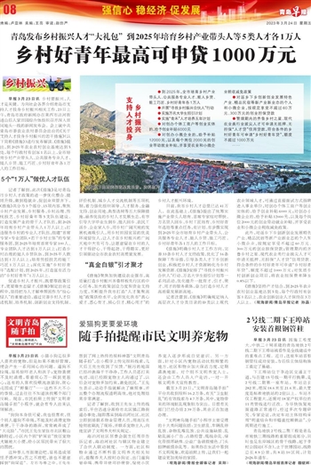记者了解到,此次《措施》是对青岛市乡村人才政策的进一步优化整合、提质升级,做到稳就业、促创业双管齐下。《措施》共分为3个部分、15项内容,聚焦乡村产业发展、乡村服务、乡村治理、传统技艺、乡村好青年等5支队伍建设。打造发展产业的骨干人才队伍,到2025年培育乡村产业带头人1万人以上;打造服务乡村的专业人才队伍,组建“首席专家+专业团队+若干乡村主体”的专家服务团,到2025年培育首席专家100人、专业团队人才达到1万人以上;打造乡村治理的能人乡贤队伍,到2025年人数达到1万人以上;培育传授技艺的能工巧匠1万人以上;深化实施“乡村好青年”选配计划,到2025年,打造富有活力的“乡村好青年”1万人以上。