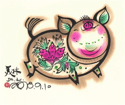 韩美林的生肖作品造型百变,门类繁多。他将写实、夸张、抽象、写意、工笔、印象等诸多手法和东西方艺术巧妙地融为一体,形成了自己特征鲜明的独特风格。他消化、吸收、融合了中国古代装饰艺术的规律,随手拈来、信手必得,展现出独具美感的装饰性。在生肖水墨画中,韩美林用流畅的弧线和直线概括形体结构的关键部位,再辅以墨色,运用刷水的绘画技巧呈现动物皮毛的质感。他笔下的生肖作品,造型奇特,神态逼真,憨态可掬。