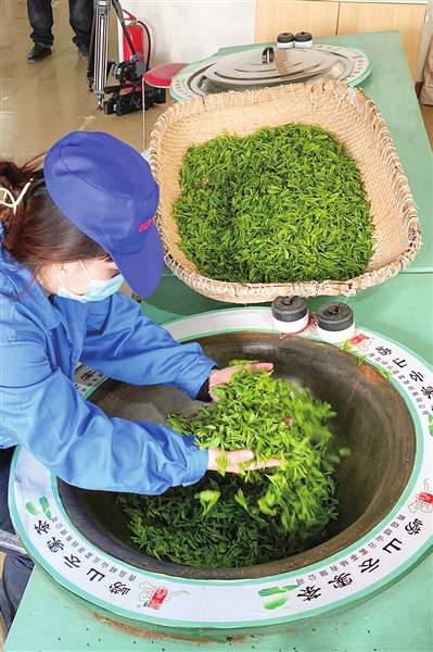 经过20多名采茶工一上午的采摘,四五十斤茶叶鲜叶采入篮中,随后经过验收、摊晾、杀青、揉捻、炒干等系列工艺,大田春茶出炉。