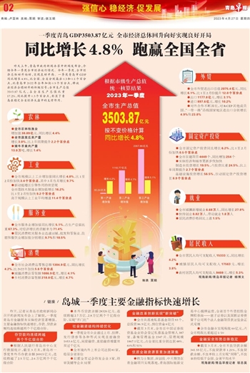 昨天上午,青岛市政府新闻办召开新闻发布会,介绍今年一季度全市经济运行情况。今年一季度,全市经济总体回升向好,实现良好开局。一季度青岛市GDP同比增长4.8%,比全国、全省分别高出0.3和0.1个百分点,比青岛市2022年全年加快0.9个百分点,释放出经济企稳回升的积极信号;全市生产总值3503.87亿元,占全省生产总值比重17.2%,同比提升0.3个百分点,彰显了青岛在稳定全省经济大盘中的支撑作用。