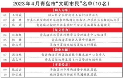 早报4月28日讯 28日,市文明办公布2023年4月青岛市“文明市民”名单,共10人入选。他们当中,有坚持献“熊猫血”超过20年,累计献血达12000毫升的无偿献血好榜样;有勇救落水游客的保洁员;有潜心服务基层文化事业的基层文化工作者;还有妻子去世后照顾岳母20年直至安详离世的79岁老人……他们用实际行动践行了社会主义核心价值观,擦亮了城市的文明底色。