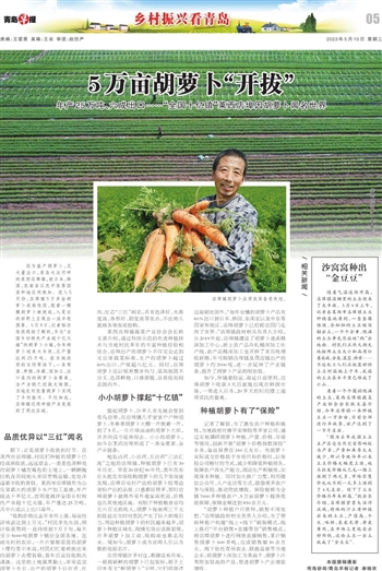 因为盛产胡萝卜,且大量出口,青岛大沽河畔的莱西店埠镇,被日本、韩国、东南亚以及中东等国家和地区所熟知。进入5月份,店埠镇5万多亩胡萝卜成熟收获,随着一棵棵胡萝卜被拔起,入夏后的田野上呈现出一派丰收图景。5月9日,记者探访收获现场了解到,作为“全国乡村特色产业超十亿元镇”的胡萝卜小镇,今年胡萝卜迎来大丰收,总产量达到25万吨。在当地政府的支持帮助下,一条育苗、种植,冷藏、深加工、出口在内的胡萝卜全要素、全产业链已经做大做强,当地农村依靠胡萝卜实现了乡村振兴。不仅如此,店埠镇还将种植产业发展到了周边区域。