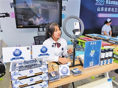 ◀职校学生展示直播带货技能。 观海新闻/青报全媒体记者 韩星 摄