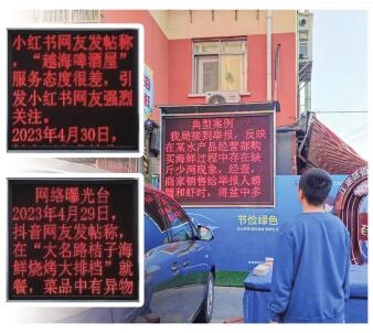 “小红书网友称某某饭店服务态度差,引发网友强烈关注。”“某某饭店4月29日—5月4日共收到消费投诉7起,数量较多。”近日,设置在市北区营口路农贸市场斜对面的一块电子显示屏引起群众的围观,在仔细阅读了显示屏上的文字后,营口路市场及周边商户有的暗自庆幸,有的脸红心跳。