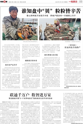 “扇贝吃起来很鲜美,价格又不贵,多年来已经成为青岛市民餐桌上不可缺少的海鲜美味。但扇贝的养殖过程非常复杂漫长。”说起养殖扇贝的辛苦,老冯笑着介绍,每年6月、11月播苗,把扇贝苗装在笼子里,放入养殖区海域。等到次年春天,扇贝苗长大一点后,需要把扇贝笼捞上来,一笼分成两三笼,再放回海里。再过两三个月后再捞上来,这时候扇贝的直径已经长到2至3厘米,渔民需要把笼子里死掉的扇贝拣出来,清理扇贝外皮上长的牡蛎苗,然后分好笼,再放回海里养。到了第二年的四五月份,扇贝就能捕捞了。