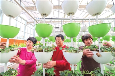 “‘鱼菜共生’的模式非常简单。鱼粪通过集滤到消化池中,经过分解处理,转变成蔬菜生长所需要的养分。经蔬菜根系吸收净化后的水,又回流到养鱼池。如此循环,实现了养鱼不换水、种菜不施肥。”石榴树下现代农业生态园负责人李盛誉介绍,“鱼菜共生”系统生产高效、产品优质、效益可观,一般20天左右就可收获一茬蔬菜。薄荷、茴香、迷迭香等7天就可收获;中华鲟鱼6个月就能长到10斤左右,达到上市标准。一个1200平方米的大棚,年产鱼3万斤、蔬菜40万斤,收入120万元左右。
