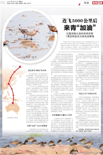 “红腹滨鹬只是在青岛漫长海岸线‘加油’的众多迁徙鸟类之一。”青岛市观鸟协会副会长徐克阳告诉记者,众多长距离迁徙的候鸟都会在中国沿海特别是山东半岛上下的渤海湾和胶州湾停留补充能量。很多红腹滨鹬是在东南亚过冬,但有些个体也会在澳大利亚和新西兰等地过冬。