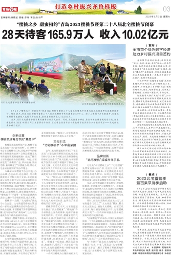 6月2日,“樱桃之乡 甜蜜相约”青岛2023樱桃节暨第二十八届北宅樱桃节闭幕式在北宅街道野生派露营地举行。短短28天,青岛2023樱桃节暨第二十八届北宅樱桃节吸引游客165.9万人。除了人数创下历史新高外,本届北宅樱桃节旅游收入也创下历史纪录,拉动直接经济收入10.02亿元。