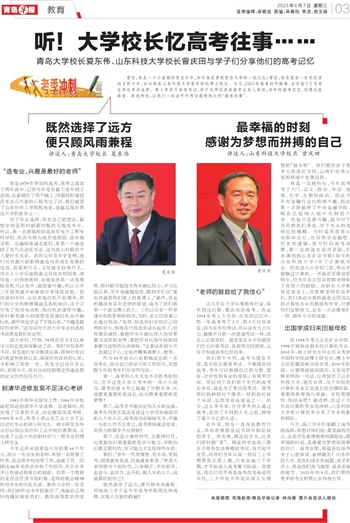 曾经,他是一个小县城的青涩少年,如今他是掌舵青岛大学的一校之长;曾经,他是高密一处农民家的乡村少年,如今他是山东科技大学最年轻的博士校长。今天,2023年高考拉开帷幕,全市超5万名考生奔赴考场追梦。数十年岁月匆匆而过,对于这两位资深高考过来人来说,当年的高考记忆,仿佛还在眼前。战鼓响起,让我们一起去听听两位高校校长的“高考往事”。