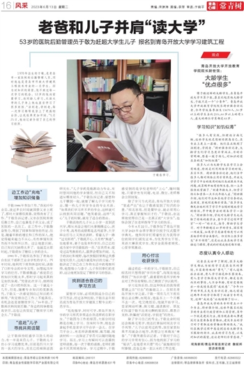 1970年出生的于敬,是青岛市一家医院的后勤管理人员,同时他也是青岛市开放大学建筑工程技术专业的一名学生。因为对知识的渴望,他不放过每一次学习的机会。53岁的他向前辈学习,向同龄人学习,从读大学的儿子身上他也直言学习了很多东西。“活到老,学到老,每一次学习都帮我登上了更高的台阶,让我眼界更加开阔。”5月25日,他向记者介绍了自己的学习经历。