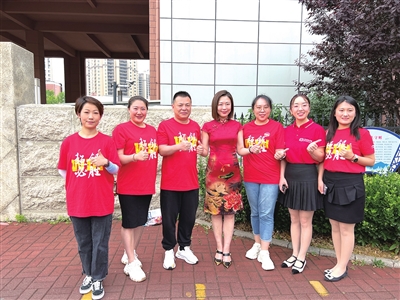 青岛超银学校副校长、超银中学(广饶路、金沙路校区)校长张卉(中间)为学生送考。学校供图