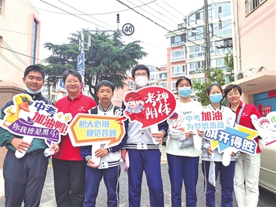 青岛市北中学校长张青涛(左二)为学生送考。学校供图