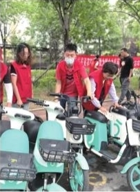 志愿者整理共享单车。