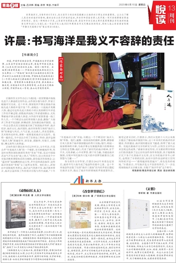 身为报告文学作家,许晨自2012年来青岛定居后,就将书写大海当成了他创作的重中之重。这十年来他创作出版了包括“海洋三部曲”在内的多部长篇纪实海洋文学,推出了海洋科研领域的多部重要作品。接受记者采访时,许晨表示,我们从党的十八大以来真正提出了建设海洋强国目标,这十年来我们的海洋经济建设、科技建设、海洋国防建设突飞猛进,取得了重大成果。而他扎根海洋文学的研究与写作,以报告文学作品来呈现这些成果,“感谢市委宣传部、市文联的领导和同志们给我提供了这么好的创作条件和氛围,我才能够真正沉下身子扎到海洋文化里,在文学的海洋里专心研究,也得到了丰厚的回报,如同中国作协创研部主任何向阳的评论——‘潜得越深收获越大’,青岛是我的福地。”许晨表示,书写海洋是义不容辞的责任,下一步还将围绕海洋文学做文章,无愧于“海洋作家”这个称号。
