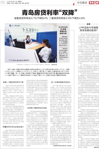 昨天,中国人民银行授权全国银行间同业拆借中心公布,贷款市场报价利率(LPR)为:1年期LPR为3.55%,5年期以上LPR为4.2%,均较上一期下降10个基点,也是继去年8月22日后,LPR再次调整。同一天,记者从多家银行了解到,随着贷款市场报价利率下调,青岛首套房贷利率由4.1%相应下调为4%;二套房贷利率由4.9%相应下调为4.8%,目前已开始执行最新利率政策。