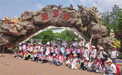 夏令营小营员们在世博园萌宠乐园门口合影留念。