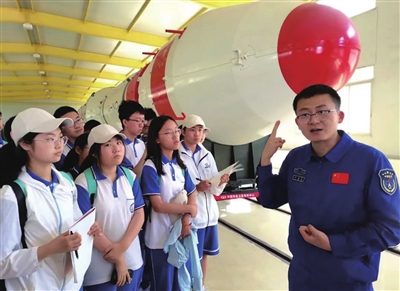 在他的引领下,青大附中的200多名学子来到西昌卫星发射中心的发射工位,走进了实体火箭总装厂房。“这是长征三号实体火箭,它的长度是44米,一二级直径是3.35米,推力是300吨……长三系列火箭战功赫赫,它可是名副其实的‘金牌火箭’!”从火箭前期测试到后期星箭总装,从火箭燃料加注再到点火发射,整套复杂的火箭卫星发射流程在学子们面前徐徐展开……