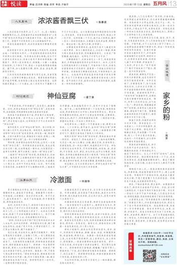 汪曾祺先生说:“很多菜都是馋人瞎琢磨出来的。”我算是个馋人,平时喜欢捣鼓些吃的,更是忘不了家乡那浓香的粉扎味。现在购物方便,我家中一年四季都备着。粉扎有多种吃法,水煮、凉拌、炒制皆可。改良后的粉扎因为加了玉米粉,水煮时,汤清滑爽,嚼劲十足。加了豆等杂粮的粉扎有一种笃定,无须依赖浓油赤酱与高汤,白水煮后撒以青菜,颜色清爽,豆香浓郁,我觉得是对味觉的最大尊重。